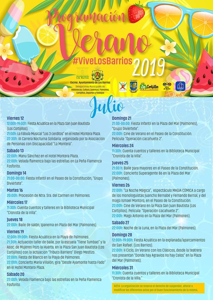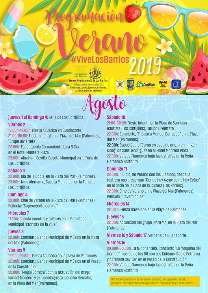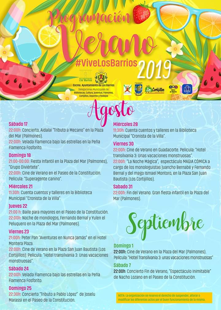 Agenda De Verano 2019 (Los Barrios) 12 julio, 201915 julio, 2019 AGENDA DE VERANO 2019 (LOS BARRIOS) PROGRAMACIÓN EN PDF Verano 2019_Los Barrios INFORMACIÓN https://www.facebook.com/turismo.villadelosbarrios/