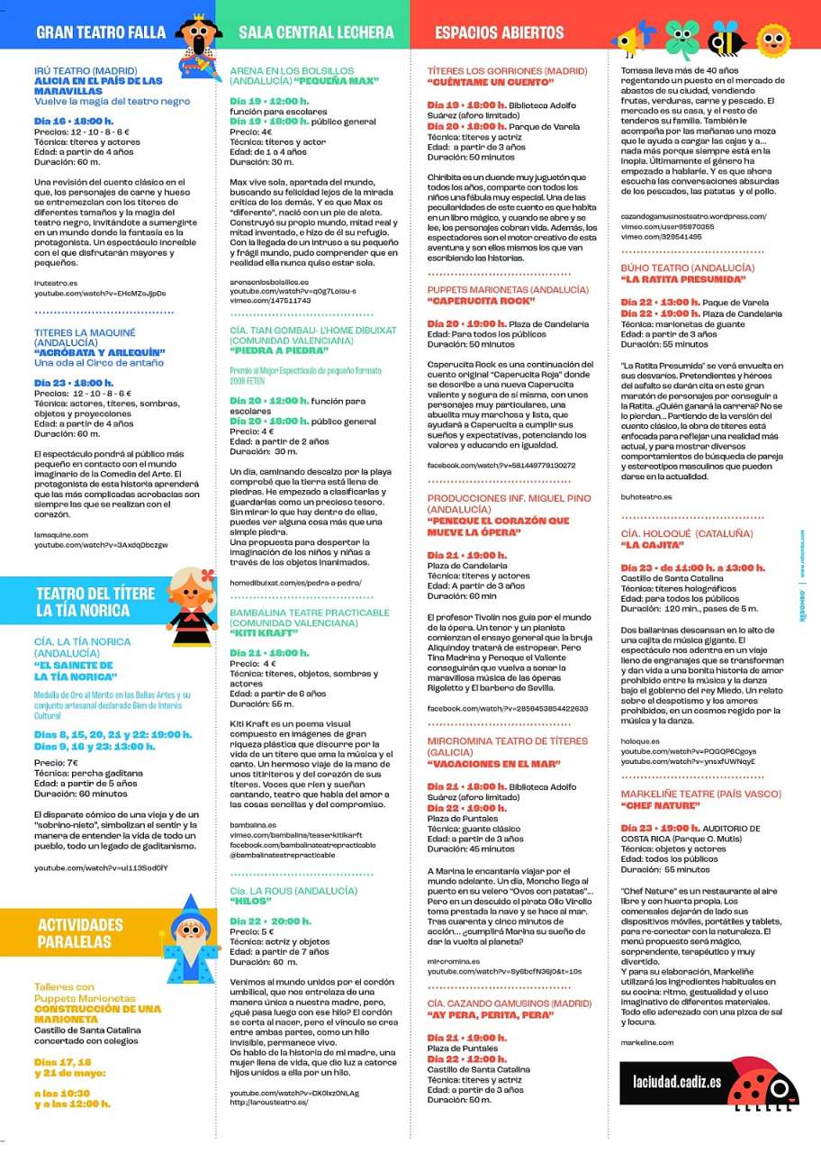 Del 21 al 26 de mayo de 2021 tendrá lugar el XXXVI Festival Internacional del Títere “Ciudad de Cádiz”. En esos días podremos disfrutar de 15 compañías que ofrecerán 30 funciones. en el Teatro Falla, la Sala Central Lechera, El Teatro de la Tía Norica y otros espacios así como diferentes plazas de la ciudad.
