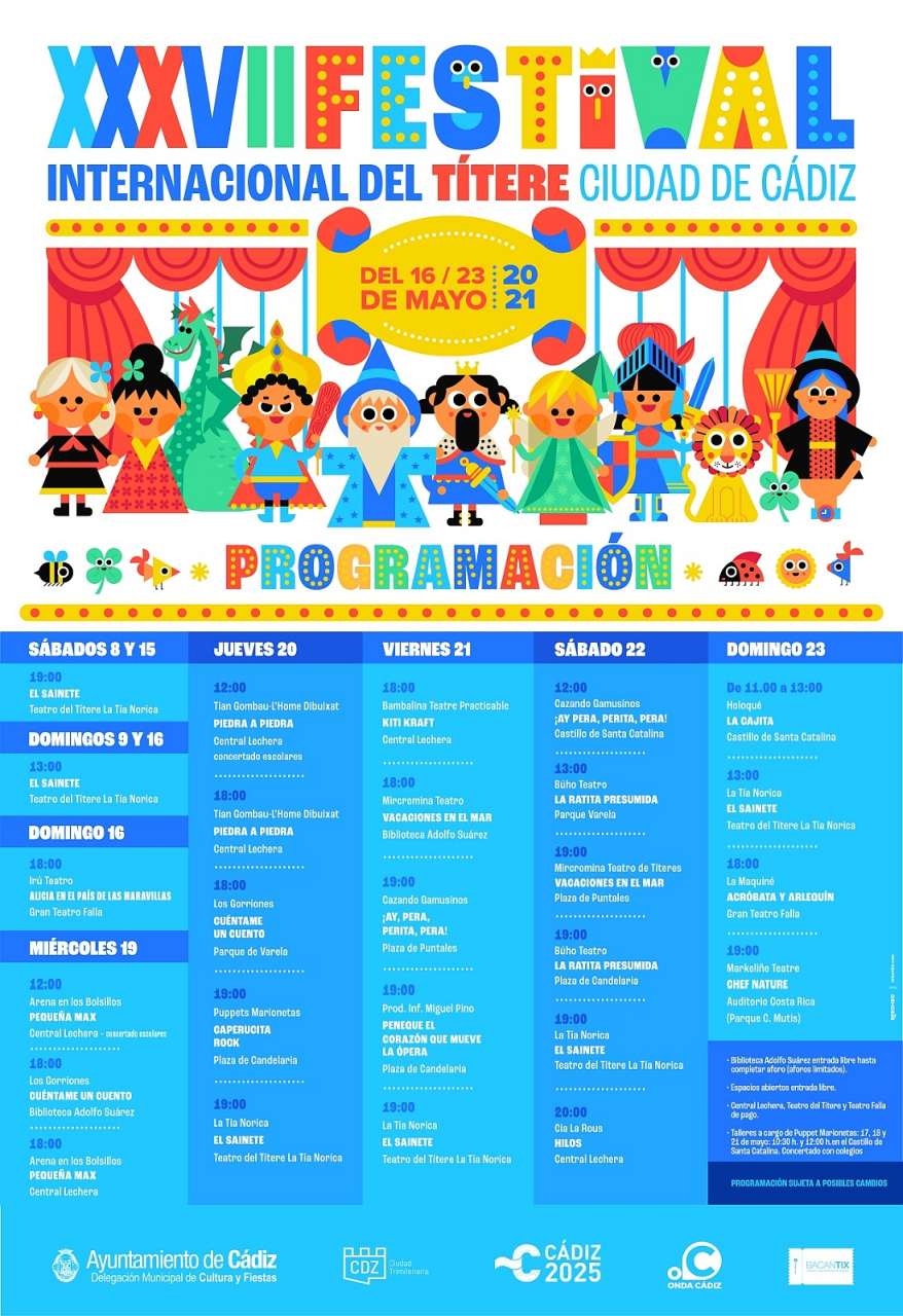 Del 21 al 26 de mayo de 2021 tendrá lugar el XXXVI Festival Internacional del Títere “Ciudad de Cádiz”. En esos días podremos disfrutar de 15 compañías que ofrecerán 30 funciones. en el Teatro Falla, la Sala Central Lechera, El Teatro de la Tía Norica y otros espacios así como diferentes plazas de la ciudad.