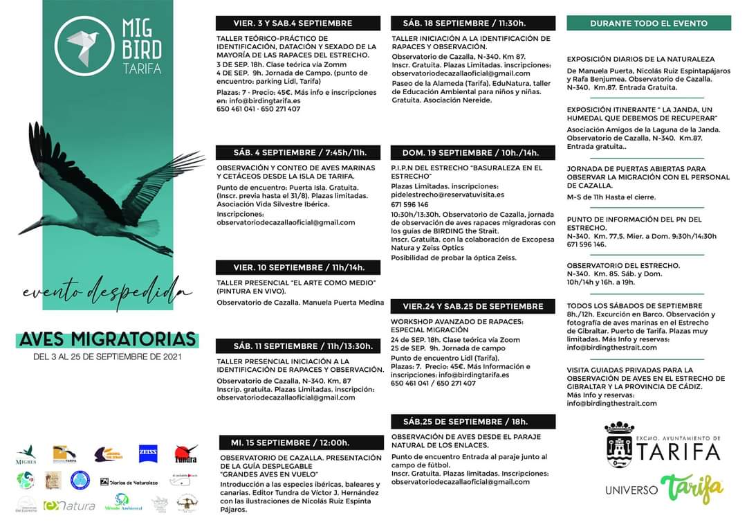 Este año vuelve a celebrarse en Tarifa este evento relacionado con las Aves Migratorias con variedad de actividades, talleres y exposiciones del 3 al 25 de septiembre de 2021.